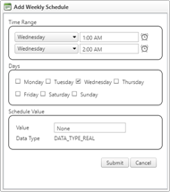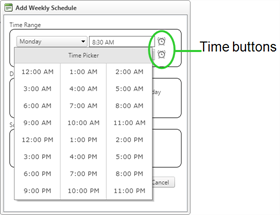 Right-click on the selected block of time and choose Add Weekly Schedule from the shortcut menu. The Add Weekly Schedule dialog opens. |
