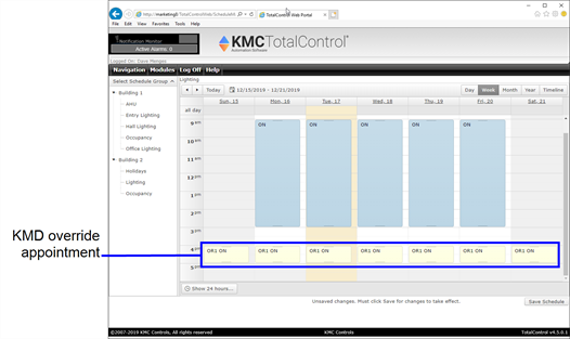 KMD override appointments set up Override 1 and Override 2 schedule times. Interaction among KMD Weekly Schedules, Annual Schedules, and override appointments will be supplied by the system administrator.