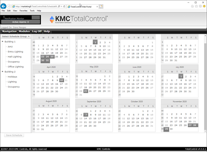 Annual schedules in KMD controllers designate special days during a year such as holidays or days a building is not occupied. Typically, an annual schedule controls the override in KMD override appointments. The exact schedule is determined by the systems engineer.